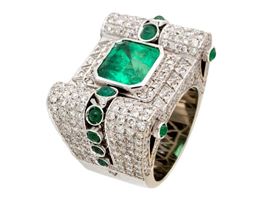 ANELLO CON SMERALDO E BRILLANTI - anello in oro bianco 750/000 con smeraldo centrale di ct 7,10 impreziosito da fitto pavè di brillanti tondi e diamanti trillion sui laterali ct 6,40 e 10 smeraldi cabochon, g 35,60 totale. Misura 23. Un meccanismo rende possibile lo sgancio dello smeraldo.