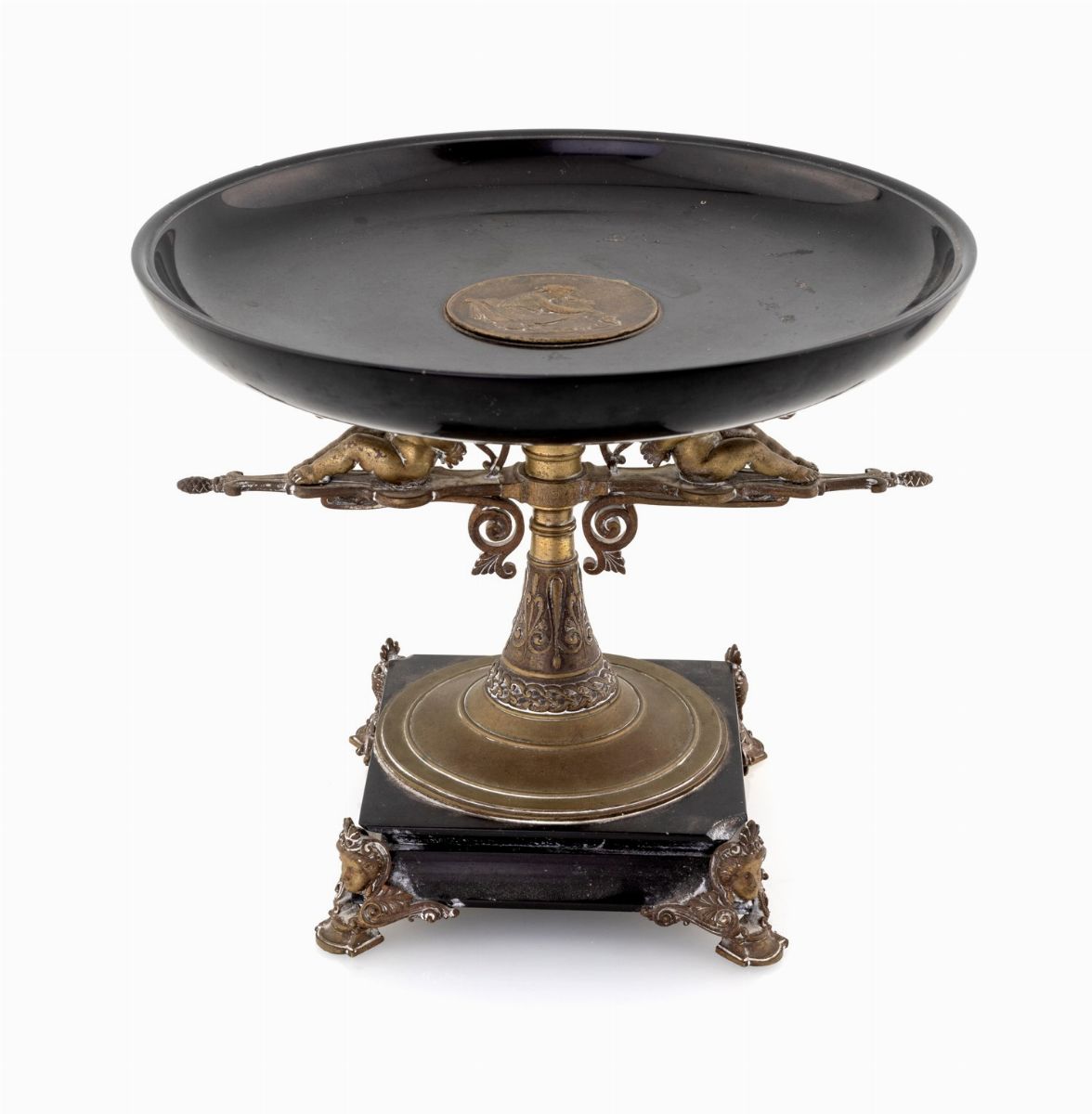 con vaschetta circolare centrata da medaglione classico, poggiante su piede ornato da più ordini di decorazione; due figure contrapposte di amorino idealmente sedute su un'asse fungono da ulteriore sostegno alla coppa. Base squadrata sorretta da mensole angolari con mascheroni muliebri. XIX secolo.