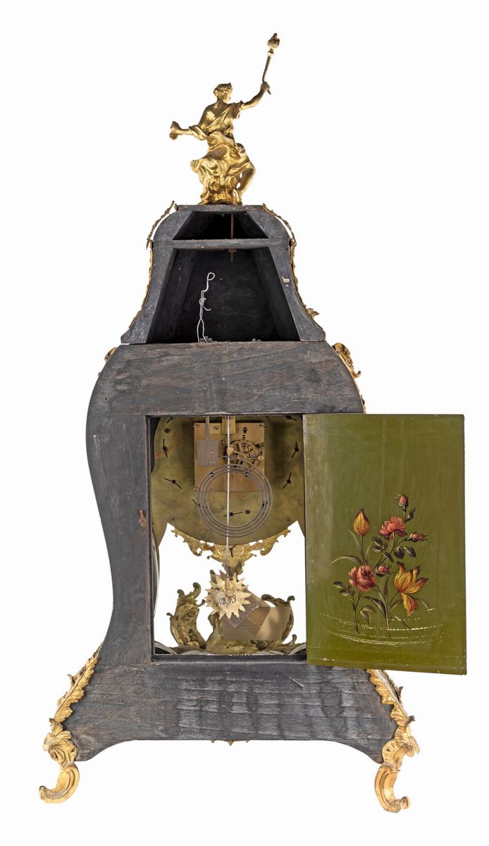 con ricca ornamentazione di bronzo cesellati e dorati; cassa sagomata su mensola a goccia decorate a motivi floreali policromi su fondo verde; fascia oraria a numeri romani su placche in smalto. Reca firma Baltazar. Francia, fine del XIX secolo.