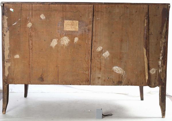 con filettature ed intarsi in legno di rosa; piano sagomato, tre cassetti frontali con spigoli prominenti curvilinei, piedi a sciabola. Napoli, metà del XVIII secolo.