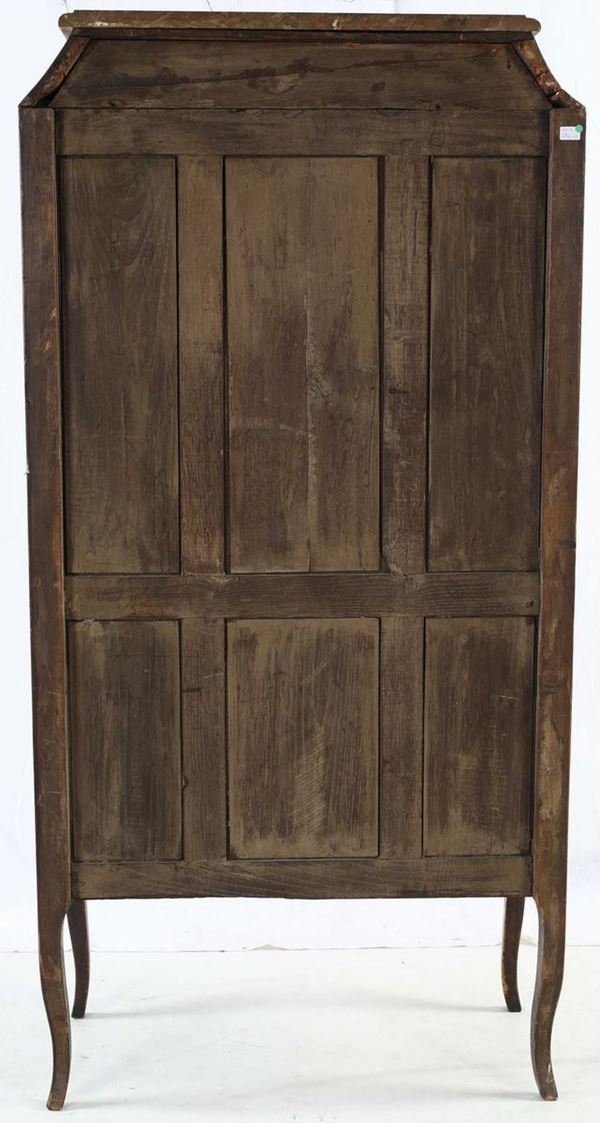 in palissandro e ciliegio, con facciata suddivisa in cinque tiretti in colonna centrali disposti a scalare con un'antina sottostante, affiancati da due sportelli centrati da losanga intarsiata. Rifinito superiormente da piano in marmo, poggia su gambe sagomate. XIX secolo.