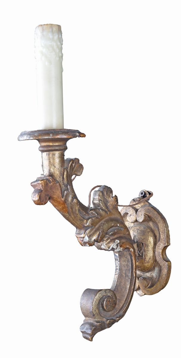 con piccolo supporto parietale in forma di scudo da cui si diparte un braccio sagomato sottolineato da rilievi vegetali.