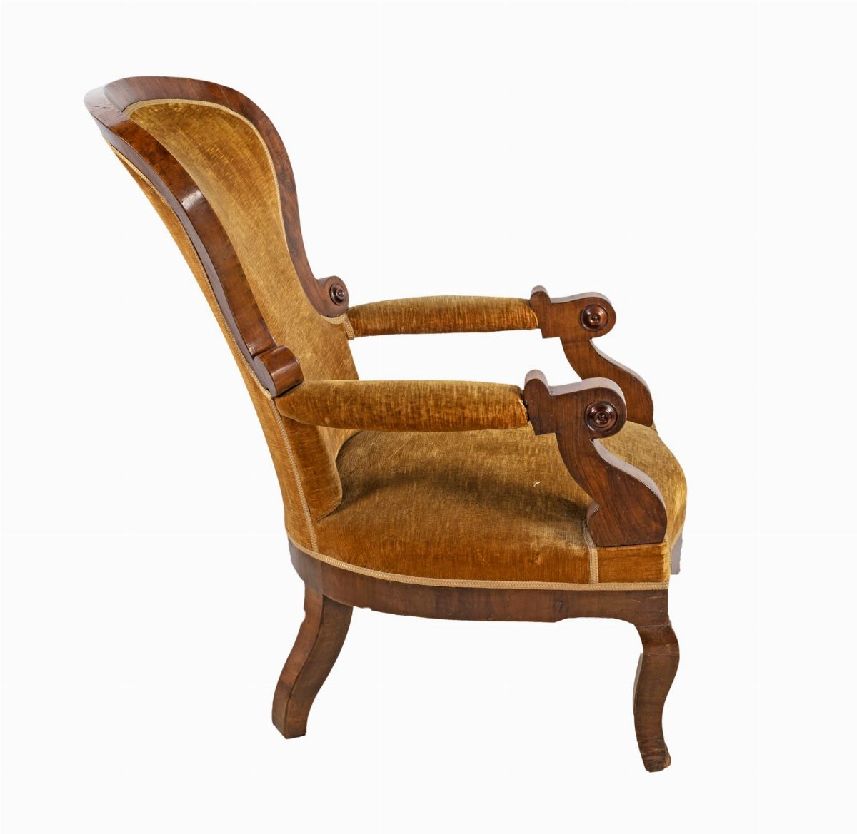 rivestite in velluto ocra; alti schienali arrotondati e lievemente avvolgenti, braccioli lineari su sostegni sagomati, così come le gambe,