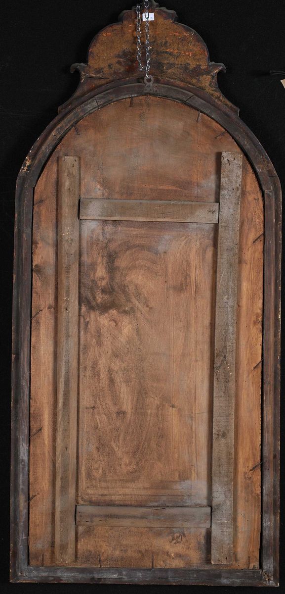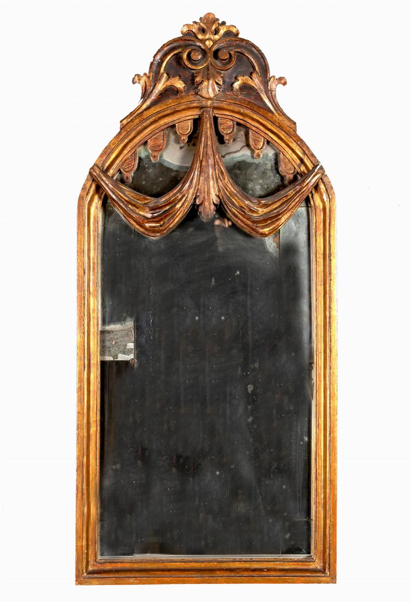 in legno dorato, con cornice modanata centinata sottolineata da lambrecchini intagliati; dal centro si diparte un fregio intagliato in forma di drappo e la sommità è dominata da cimasa a volute contrapposte. Fine del XIX secolo.