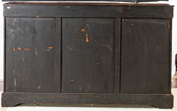 decorata da intarsi in legno di frutto a motivi floreali e rifinita da applicazioni in bronzo; facciata mistilinea a tre sportelli di cui i laterali con pannello in vetro. Inghilterra, XIX secolo.