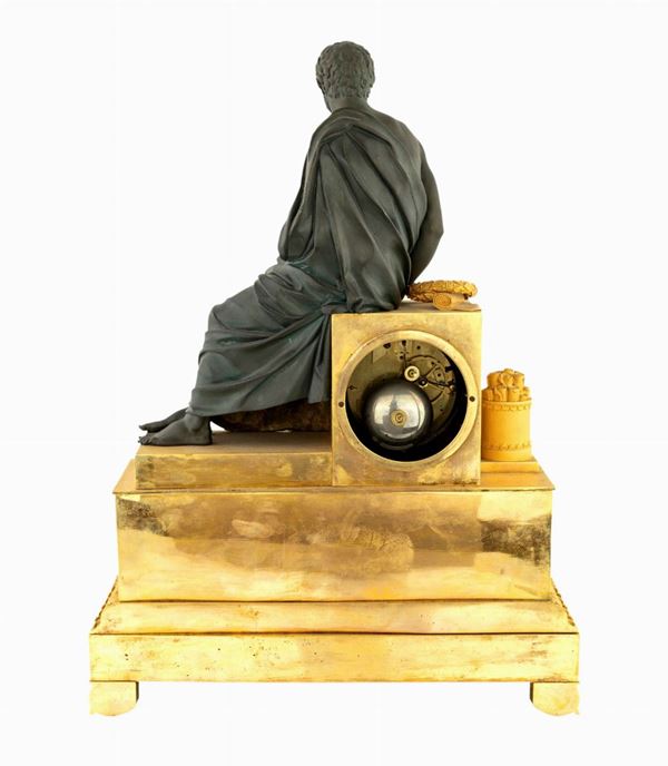 con cassa squadrata su cui siede una figura di filosofo in bronzo brunito; quadrante a due fori di carica con fascia oraria a numeri romani, piedi a mensola. Prima metà del XIX secolo.