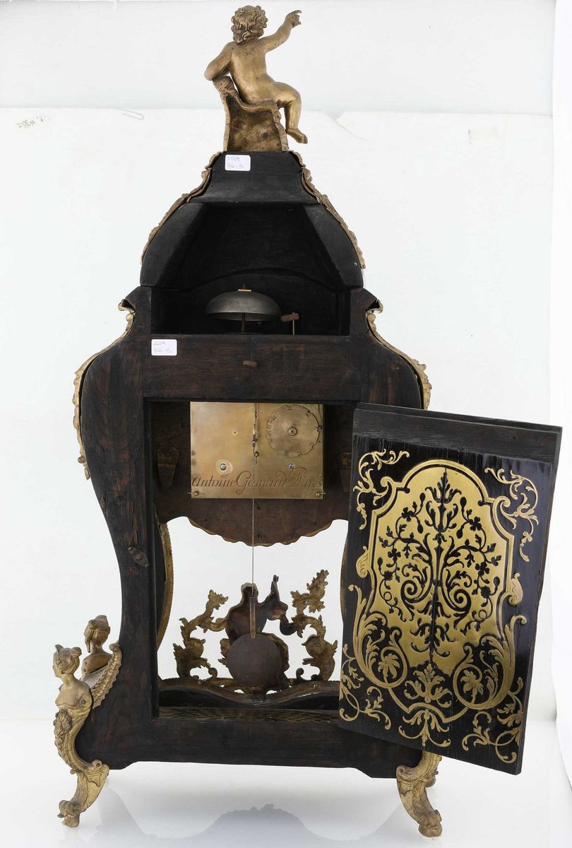 con cassa sagomata lastronata in tartaruga bruna e ricca ornamentazione alla maniera di Boulle con incrostazione in metallo dorato, abbellita da finiture ornamentali in bronzo; quadrante con fascia oraria a numeri romani ed arabi per i minuti su placche in smalto. Firmata sul meccanismo Antoine Gamard à Paris. Francia, prima metà del XVIII secolo.