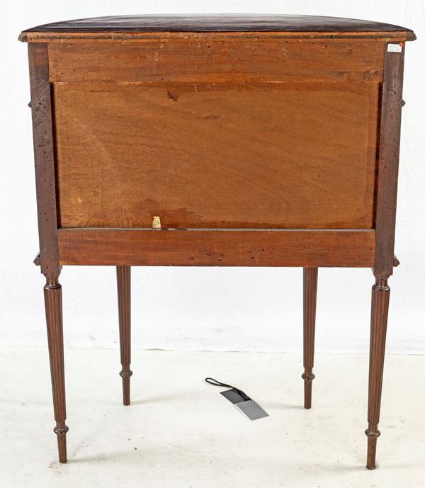 in mogano con sottili filettature in legno di frutto poste a cornice delle singole partizioni; facciata scandita da un cassetto e due sportelli, gambe rastremate.