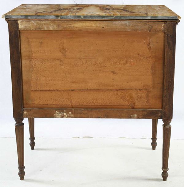 in noce con riquadri racchiusi da filettature geometriche intarsiate in legno di frutto; piano in marmo giallo, due cassetti frontali con bocchette e maniglie in bronzo, piedi rastremati scanalati,