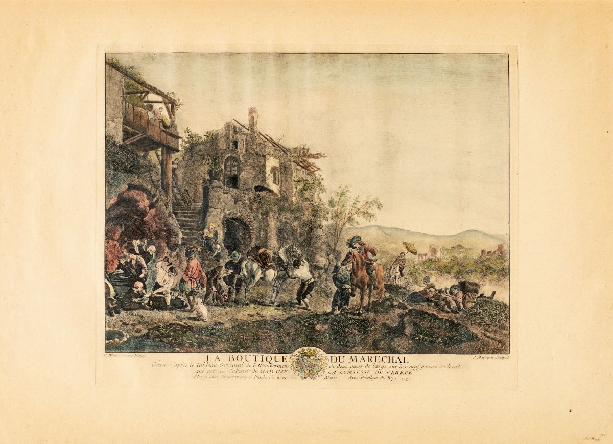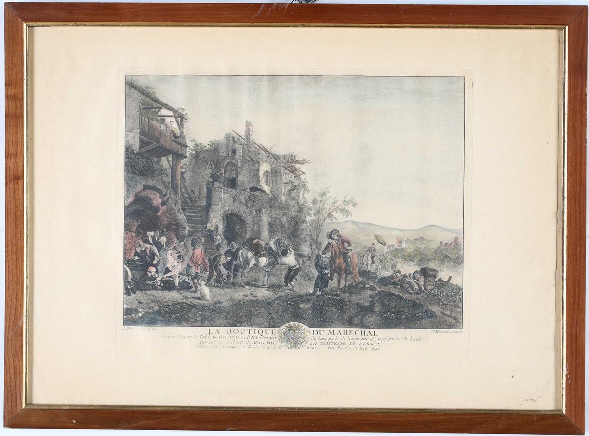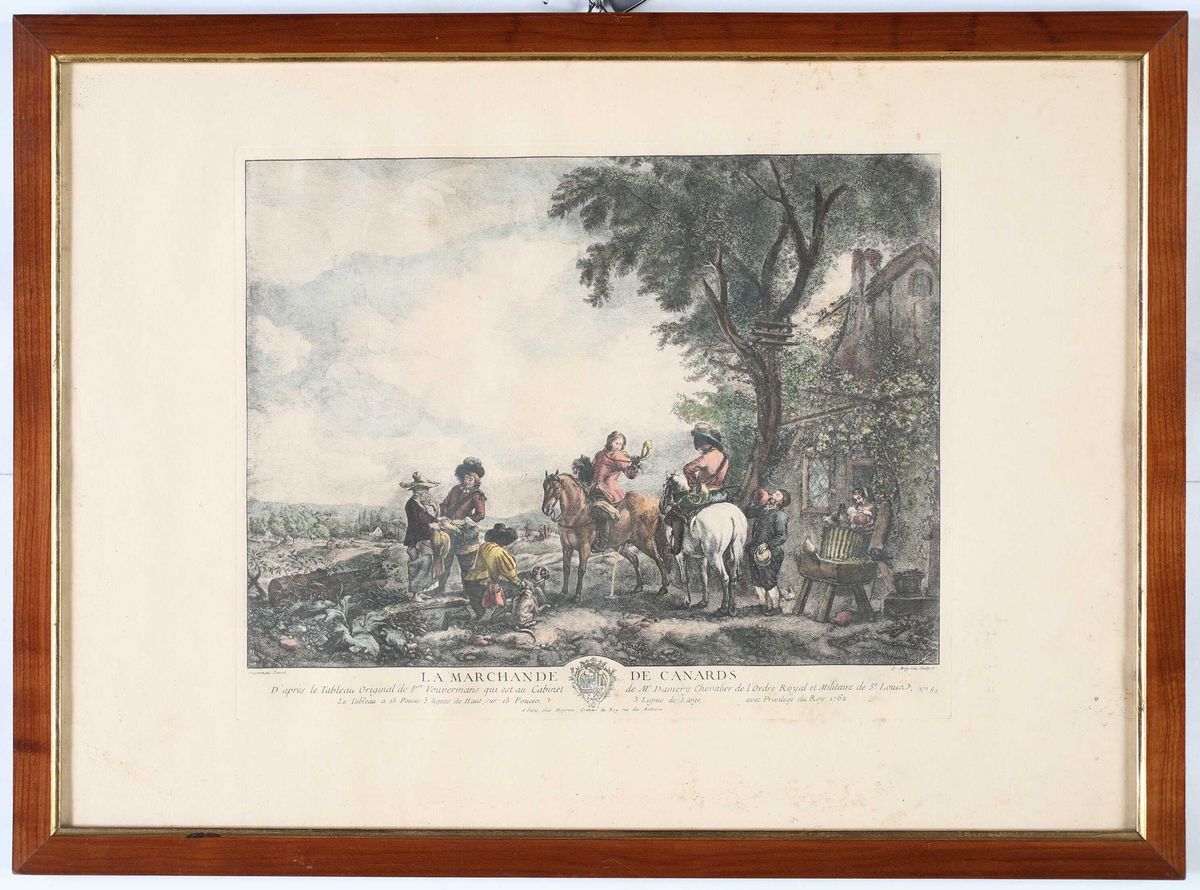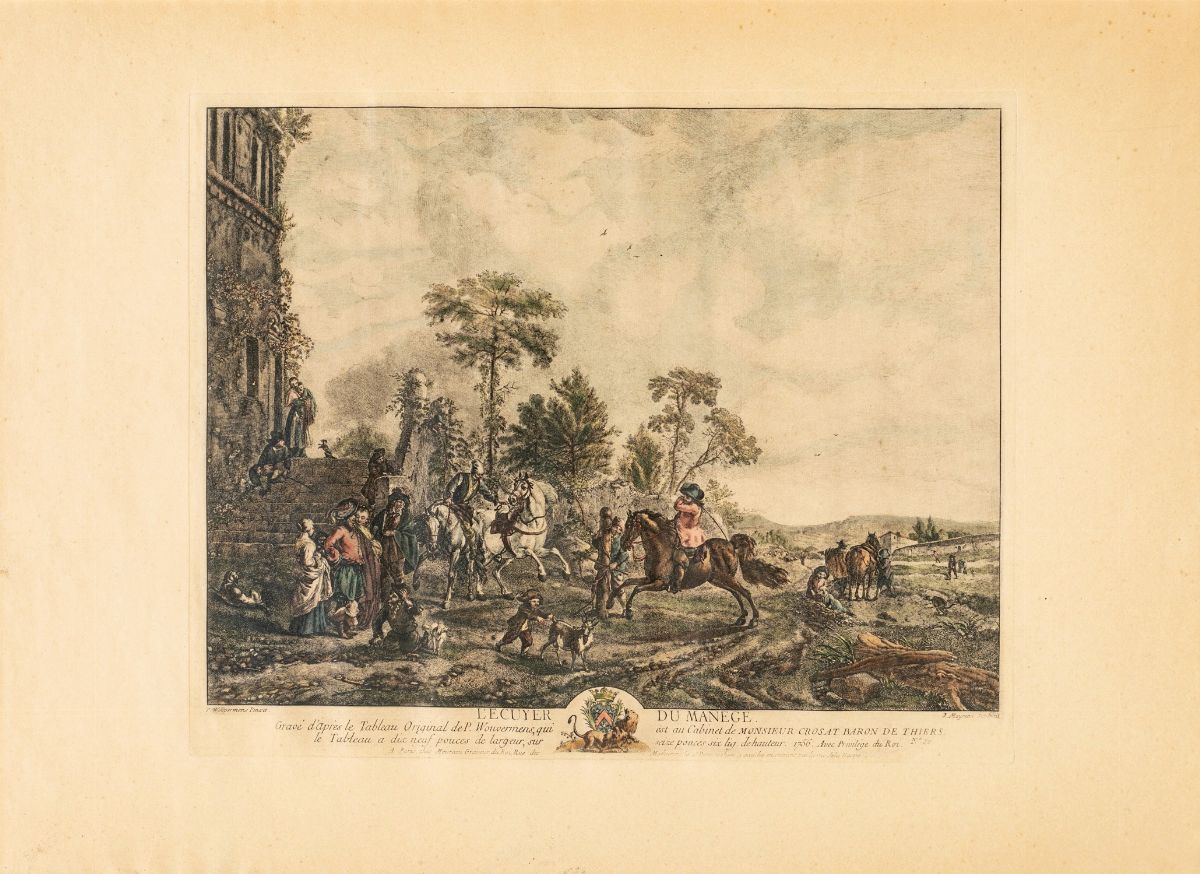 raffiguranti scene di caccia su disegni del pittore olandese Philips Wouvermens, dall'album "Oeuvres de Ph.pe Wouvermens Hollandois Gravées d’après ses meilleurs Tableaux qui sont dans les plus beaux Cabinets de Paris et ailleurs", cm 37x46 (la lastra); in cornice.
