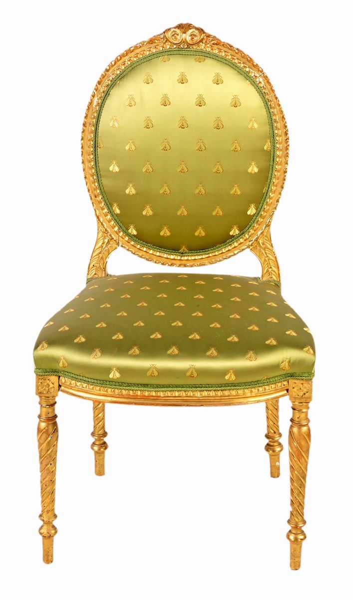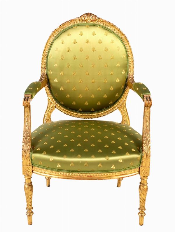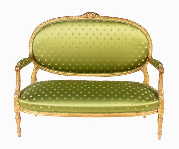 composto da un divano, una coppia di poltrone e quattro sedie con schienali e sedili imbottiti rivestiti in seta verde; cornici modanate di forma ovale, intagliate lungo i profili e sormontate da rosoni, piedi affusolati; divano cm 102x125x50; poltrona cm 98x62x52; sedia cm 90x49x44. Francia XIX secolo.