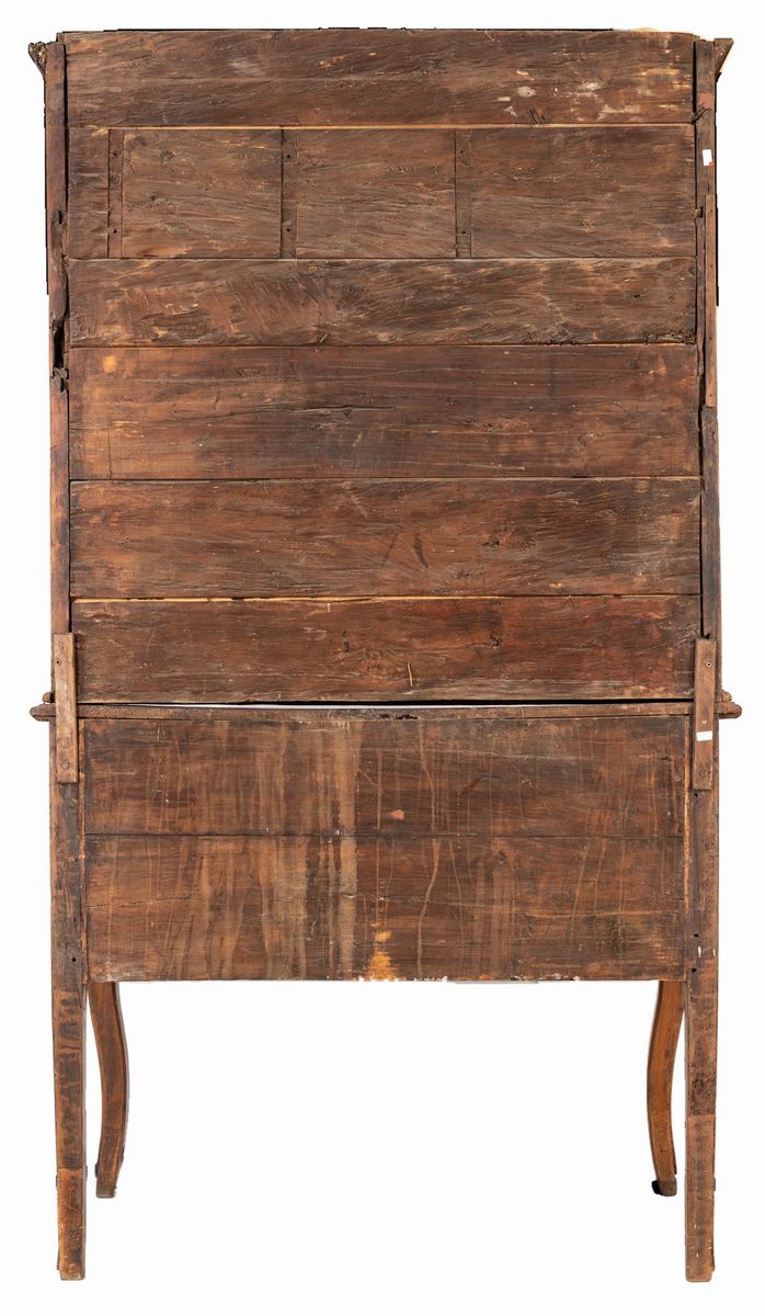 in noce; corpo superiore a due sportelli con riquadri modanati ad includere volute vegetali incise, elemento decorativo ripreso sulla ribalta e lungo la fascia; gambe sagomate. Piemonte, metà del XVIII secolo.