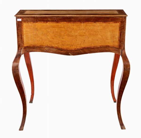 in noce con specchiature in legno di frutto entro filettaure lineari in legno di rosa; sorretto da lunghe gambe mosse, reca un cassetto compreso nella fascia e cela all'interno un ripiano e tre cassetti allineati. XIX secolo.