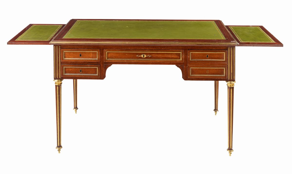 con finiture in ottone poste a guarnizione delle varie partizioni; piano rettangolare rivestito in pelle, due ripiani estraibili ai lati, cinque cassetti frontali, gambe rastremate scanalate. Francia, XIX secolo.