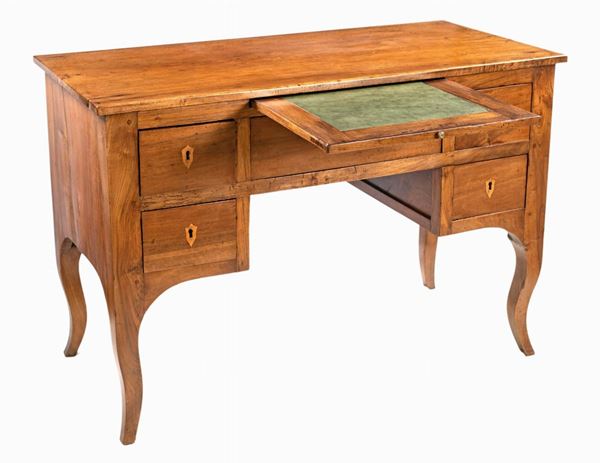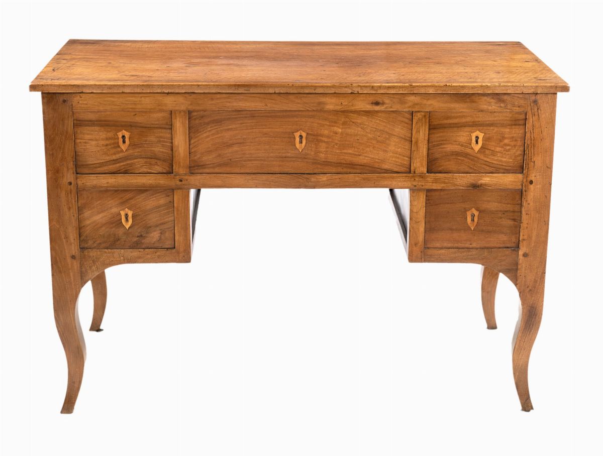 con un ripiano estraibile, tre cassetti in linea nella fascia e due ai lati del vano centrale; gambe mosse. XVIII secolo.