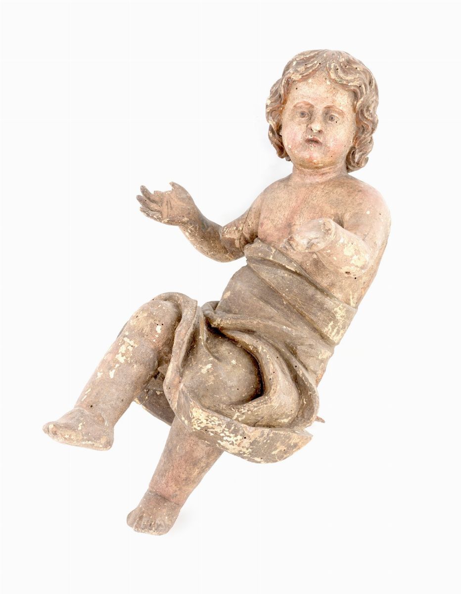 laccato raffigurante un putto seduto parzialmente coperto da un panneggio svolazzante; privo di ali. Italia centrale XVIII secolo. Lievi difetti e piccole mancanze.