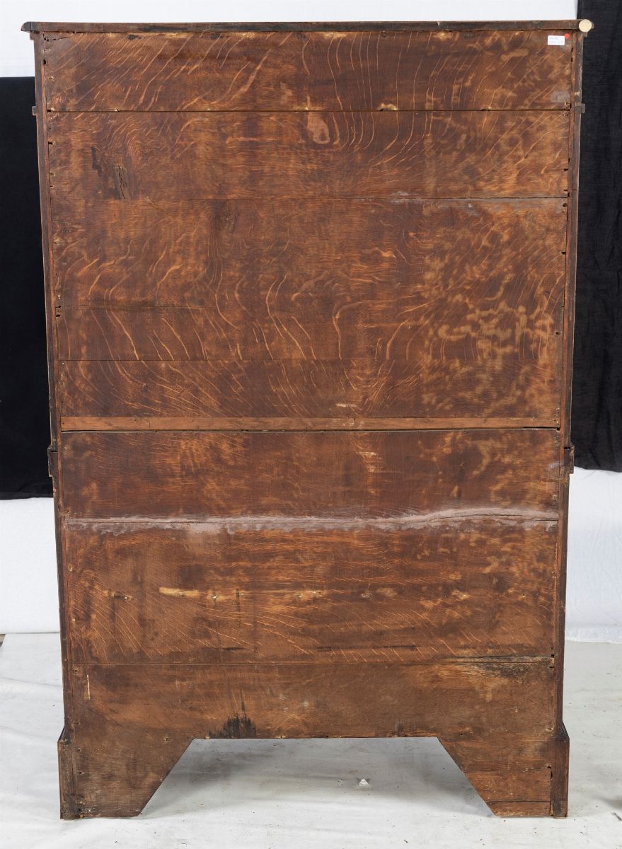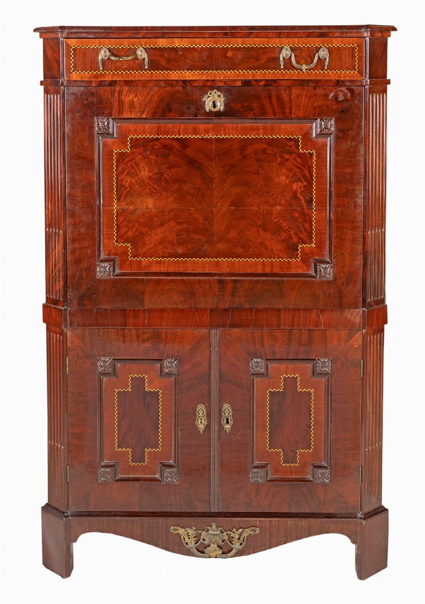 in mogano, con filettature intarsiate poste ad incorniciare le varie specchiature; all'interno della ribalta un ripiano e un vano centrale sottostante sormontato da un tiretto affiancati da tre cassetti in colonna disposti ai lati; due sportelli nella parte inferiore, piedi a mensola. Inizio del XIX secolo.