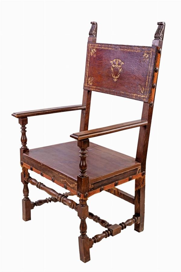 in noce con fiamme intagliate e spalliera in cuoio con impressioni dorate; sedile ligneo e braccioli lineari sorretti da balaustri, gambe e traverse tornite