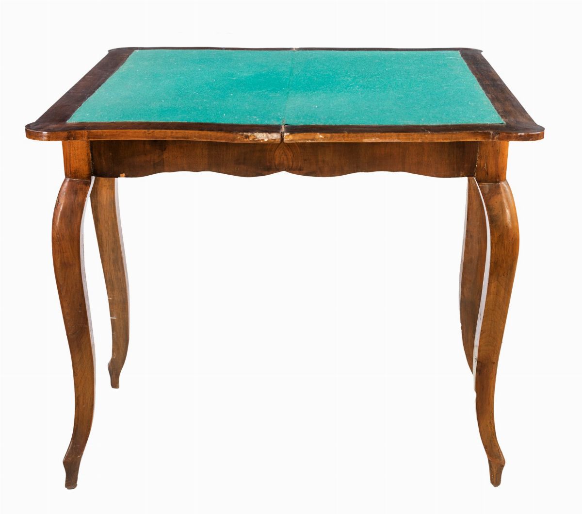 in noce con piano a libretto girevole rivestito in panno verde, gambe sagomate,