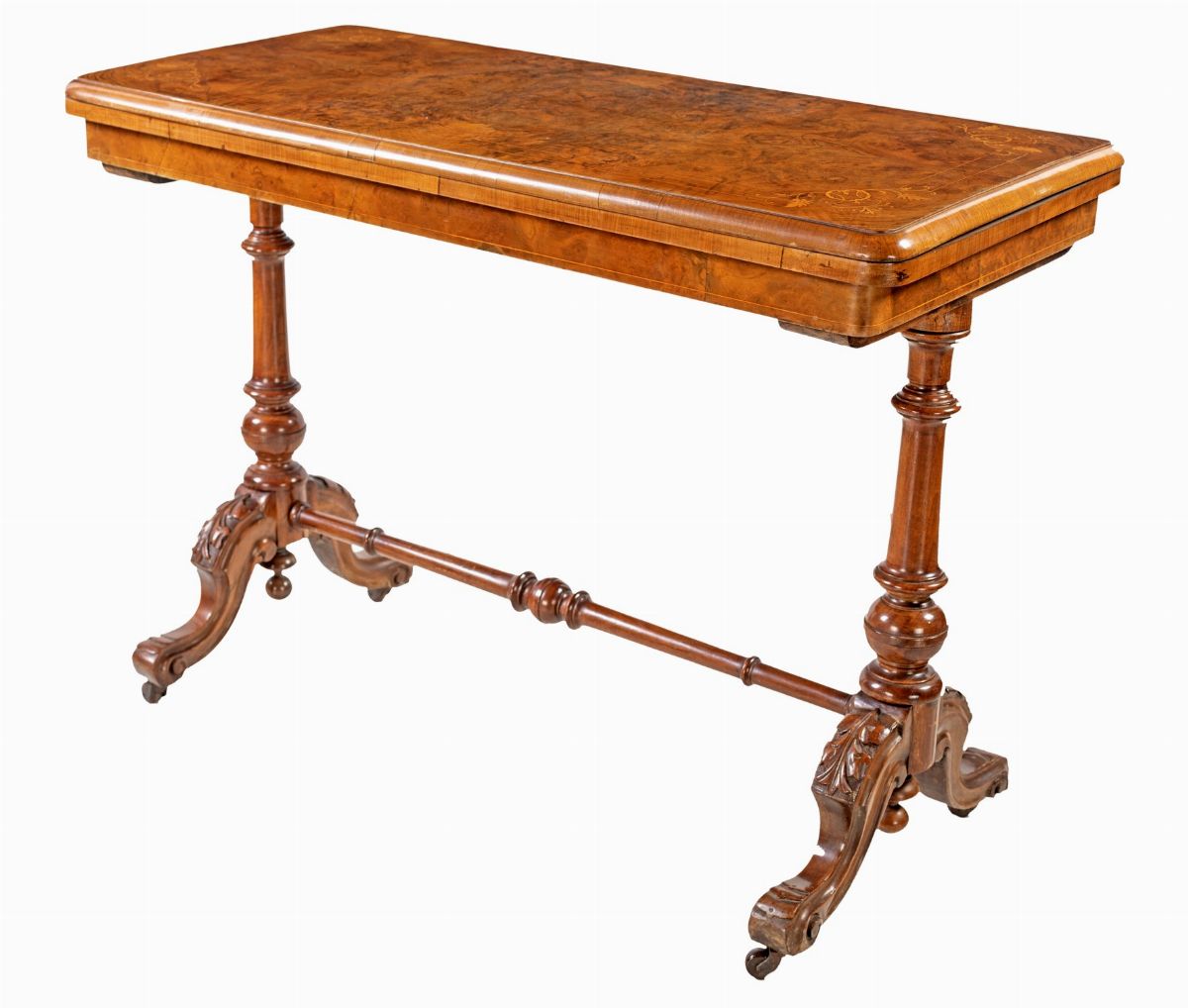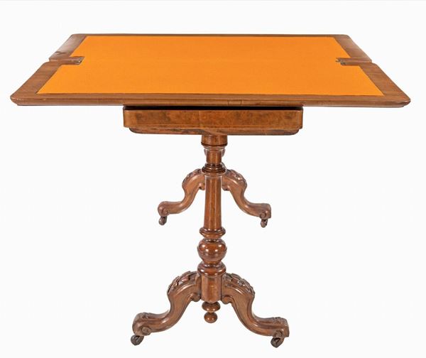 con piano a libretto ad angoli arrotondati, incorniciato da filettatura in legno di frutto e decorato da arabeschi angolari; sostegni laterali a balaustro poggianti su sostegni sagomati terminanti a ricciolo, muniti di ruote e riuniti da traversa. Inghilterra XIX secolo.