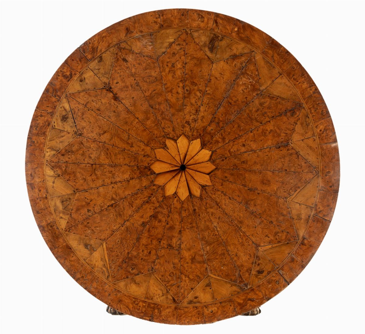 e radica con piano circolare impiallacciato a spicchi centrato da una corolla dodecagonale in legno di frutto; sostegno a balaustro sorretto da quattro piedi sagomati terminanti a zampa ferina. Prima metà del XIX secolo.