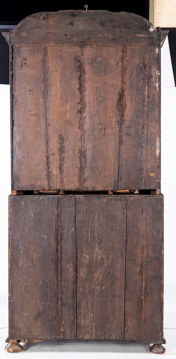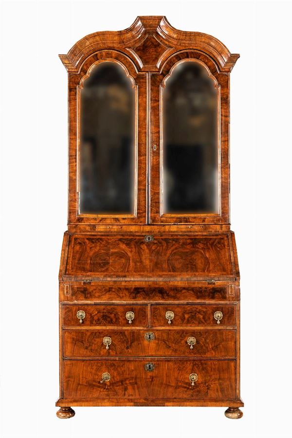in radica di noce; corpo superiore a due sportelli con specchi centinati e tablettes estraibili sottostanti; all'interno quattro ripiani e sei scomparti. La ribalta reca la porzione centrale del piano scorrevole a celare un ampio vano segreto ed ospita uno sportello centrale delimitato da lesene, affiancato da cinque divisori e due tiretti simmetricamente disposti ai lati. La parte inferiore è scandita da due cassetti allineati e due sottostanti con maniglie pendenti, piedi a plinto. Inghilterra, XVIII secolo.