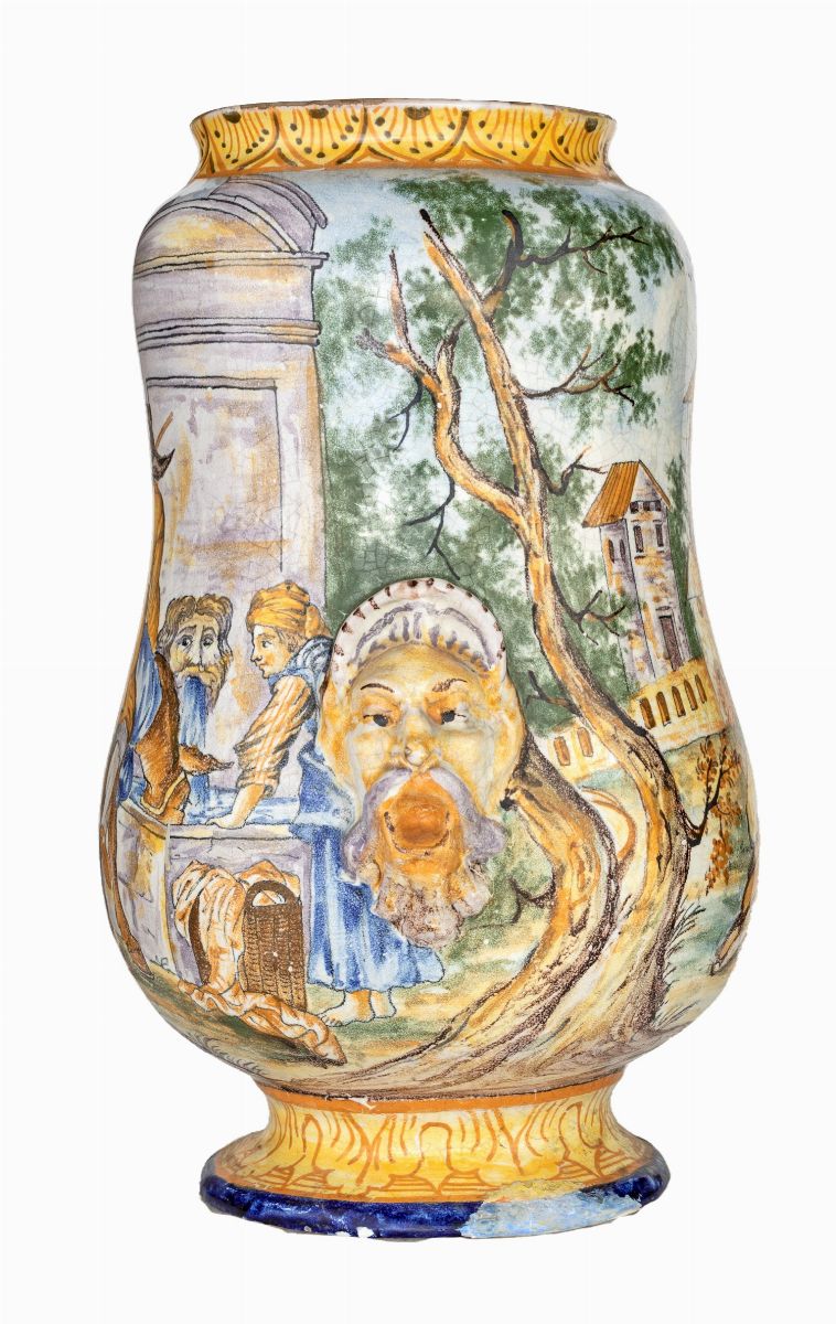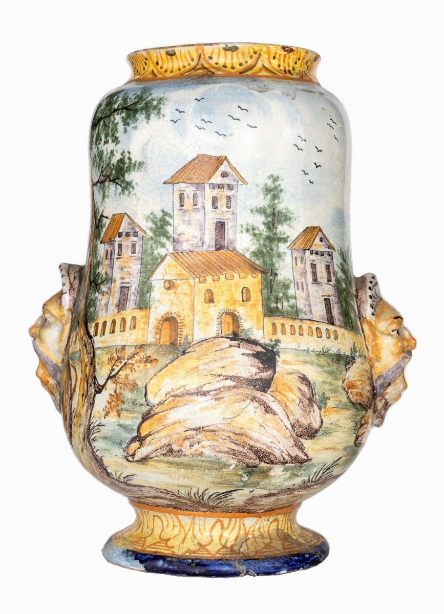 decorato a tutto tondo con un paesaggio con architetture e cavalieri e abbellito da mascheroni in rilievo. Difetti.