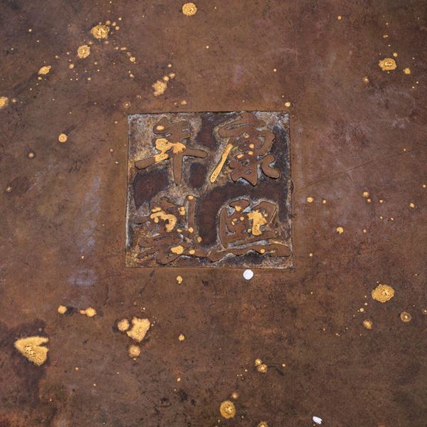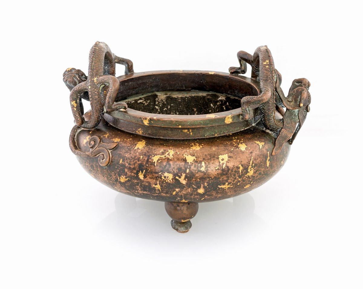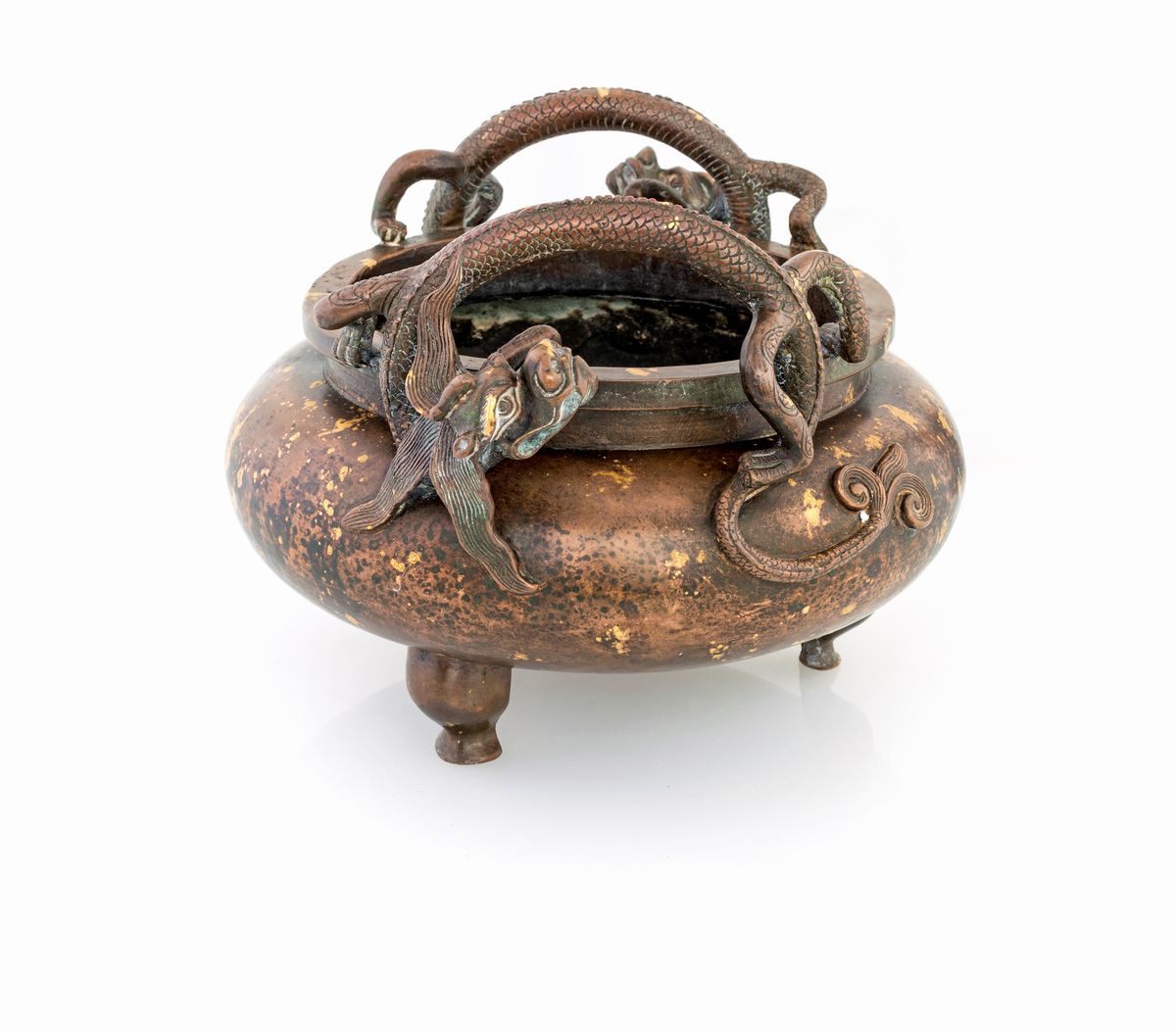in bronzo brunito con tracce di doratura, con maniglie in forma di drago. Dinastia Qing, epoca dell'imoeratore Kang Xi (1661 - 1722)