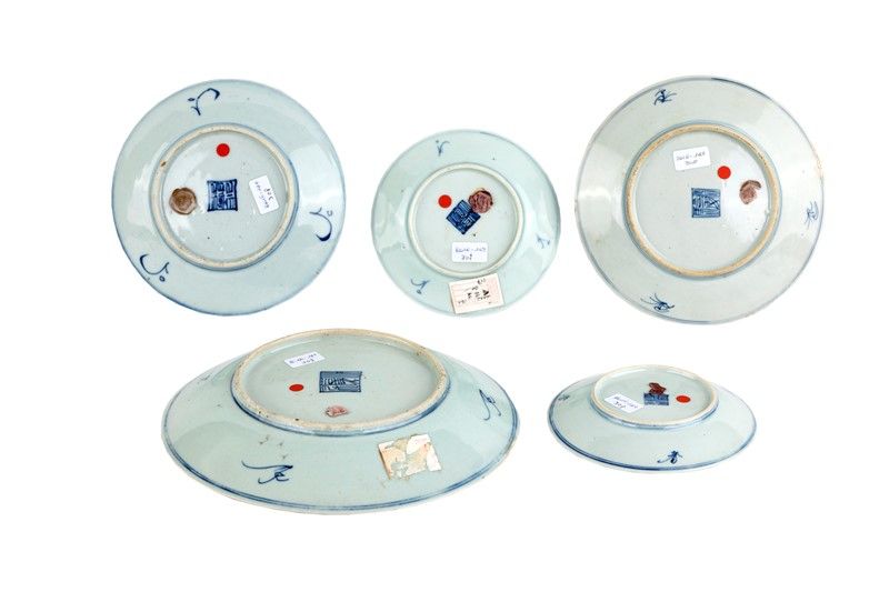 bianca e blu (qinghua) di differenti grandezze e con simili caratteristiche decorative. Al verso etichetta cartacea e sigillo in ceralacca rossa di acquisto presso negozio-museo statale.Cina, dinastia Qing (1644-1911), periodo del regno dell'Imperatore Daoguang (1821-1850).