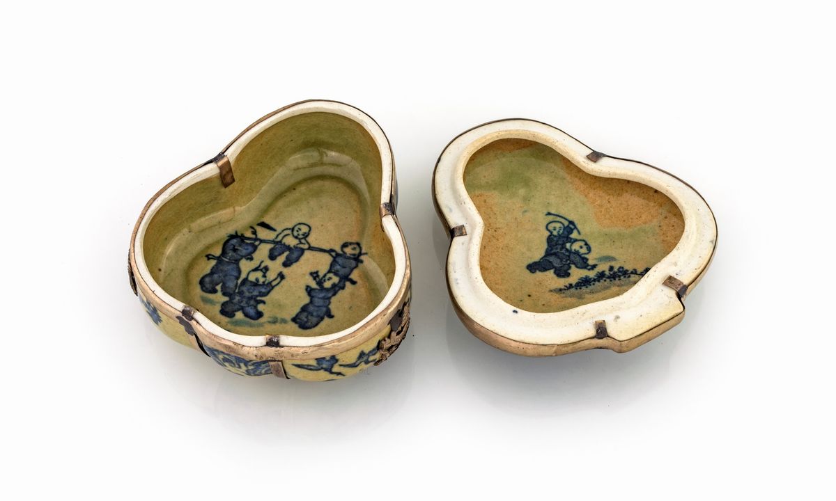 di forma trilobata con finiture ornamentali in argento con figure di drago e di fenice quali simboli imperiali; di forma trilobata è decorato in monocromia blu all'esterno con figure di Immortali accompagnati da gru e all'interno con figure giocose di bambini. Cina, dinastia Qing, Imperatore Guang Xu.