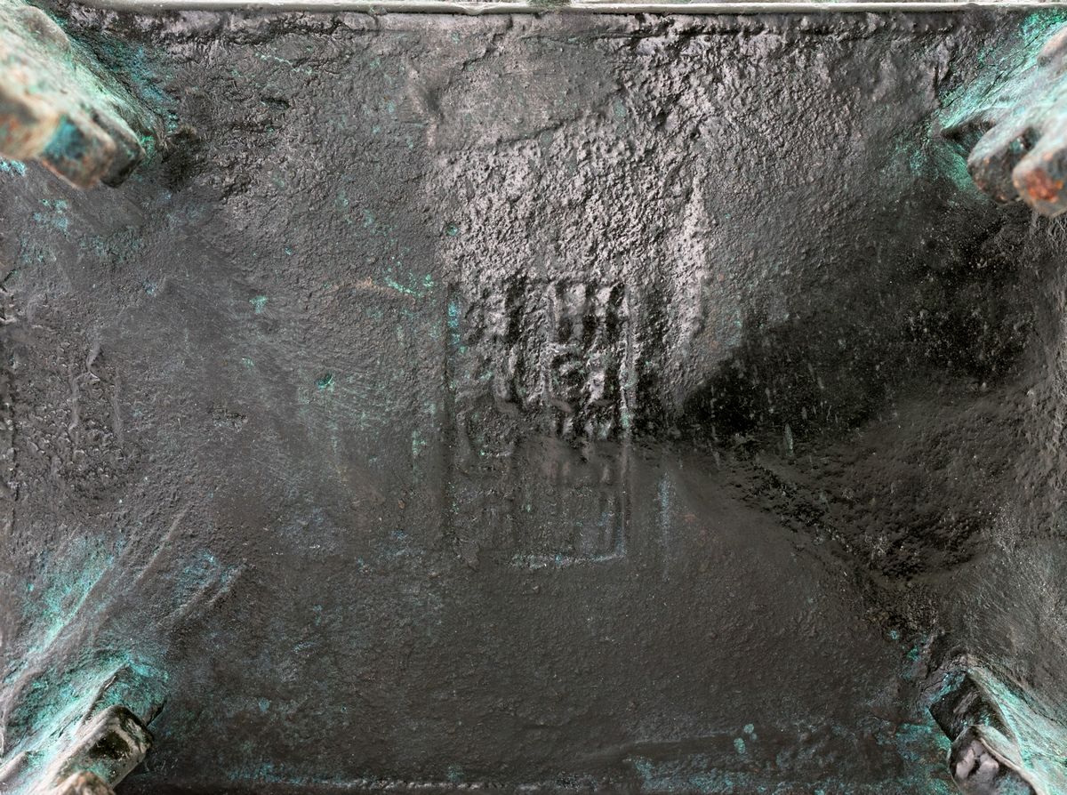 dalla caratteristica forma rettangolare sostenuta in corrispondenza di ciascun angolo da da un piede a forma di drago di carattere arcaistico, che con le fauci spalancate azzanna il bordo del contenitore. Cina, XX secolo.