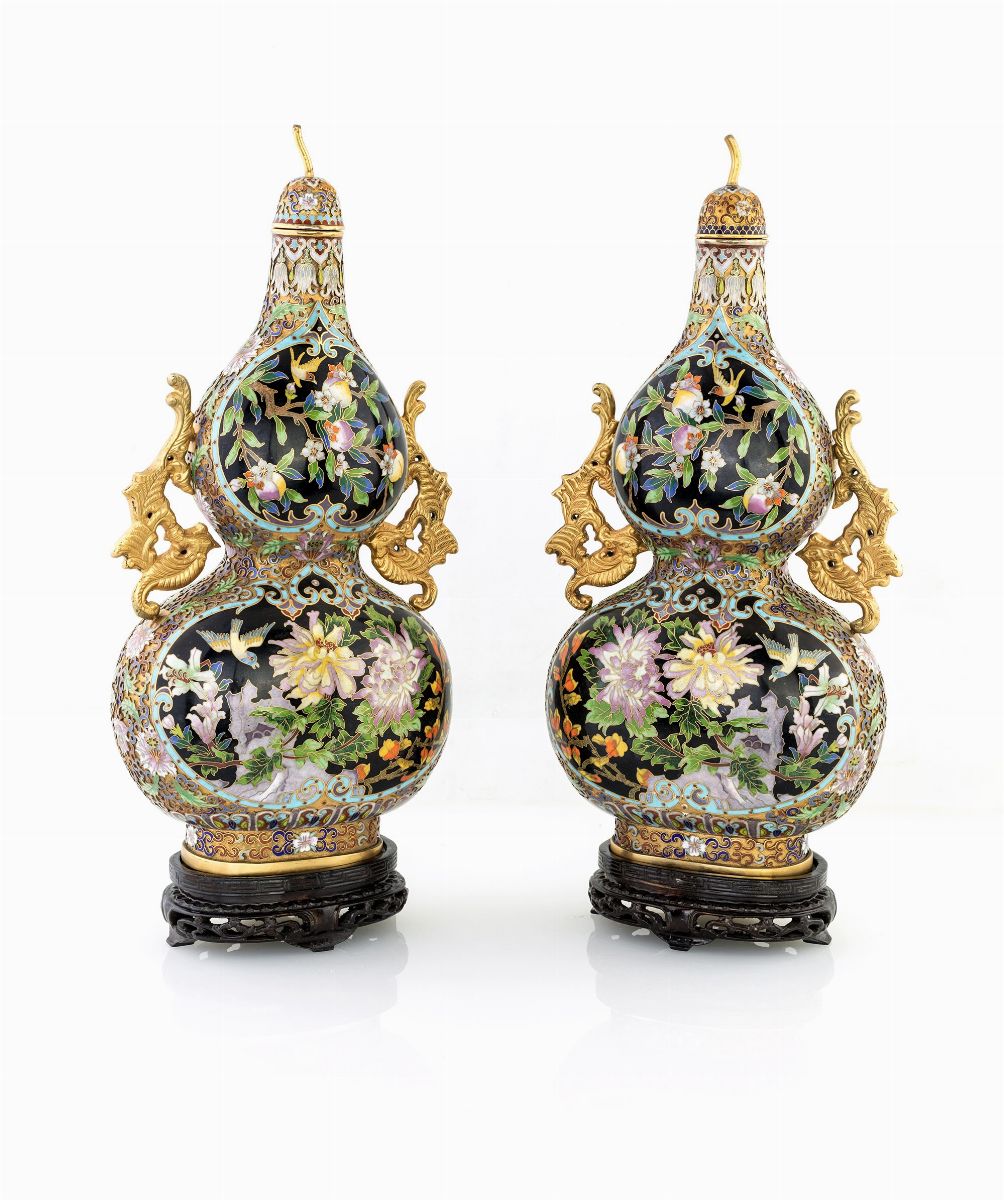 a doppia zucca (hulù) in smalto cloisonné con coperchio e anse scultoree dorate; concepiti per essere disposti vis à vis, recano decorazione in vivace policromia entro doppie riserve con grandi fiori di peonia, rami di pesco in fiore e figure di volatile, Base in legno. Cina, tarda dinastia Qing.