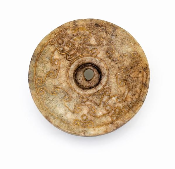 con figure di drago in bassorilievo e incisioni stilizzate al verso, gr. 246