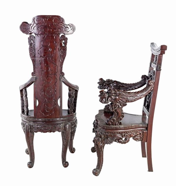 in redwood (legno massello di sequoia cinese) scolpito ed intagliato rispettivamente con figure di drago e di fenice. Cina, dinastia Qing.