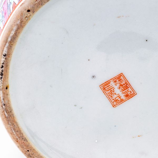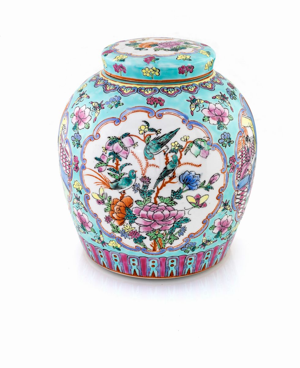 in porcellana policroma con fitta decorazione a motivi floreali su fondo celeste cielo su cui emergono riserve alternate con figure di cortigiane e composizioni fiorite con volatili e farfalle. Cina, inizio XX secolo.