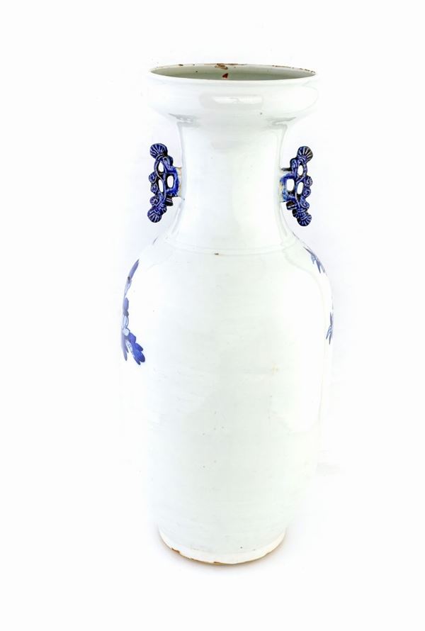 in porcellana bianca decorato in monocromia blu con rami fioriti emergenti da una base rocciosa e tre figure di volatile; bocca con profilo incurvato verso l'interno. Cina, Minguo, inizio del XX secolo.