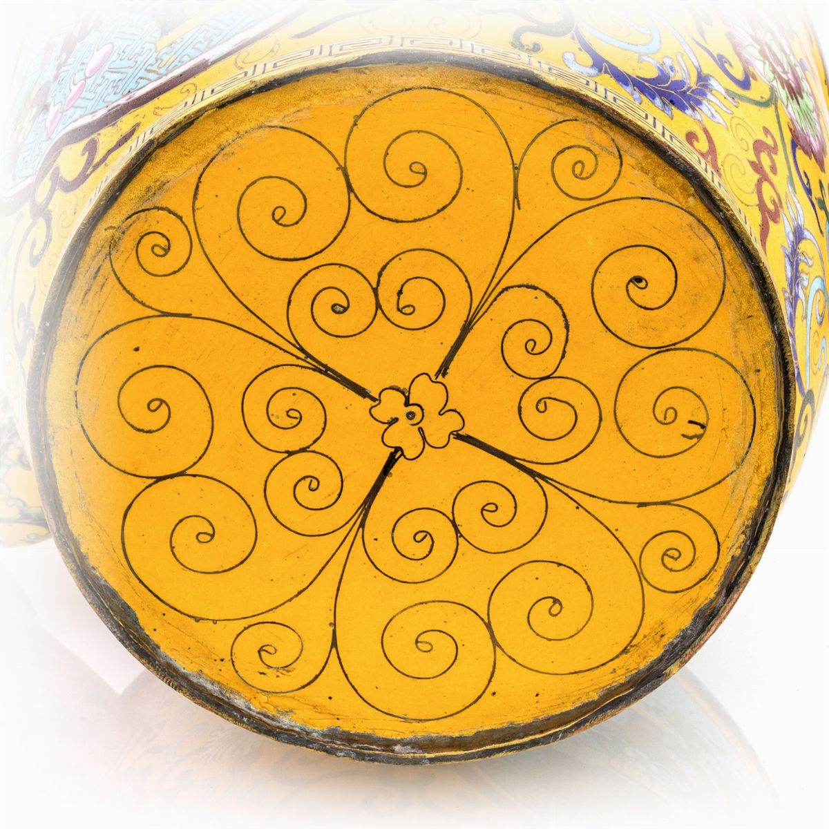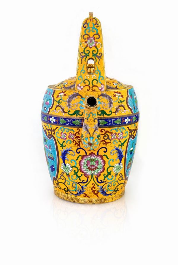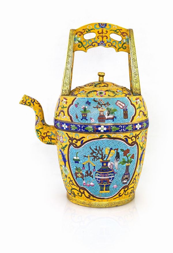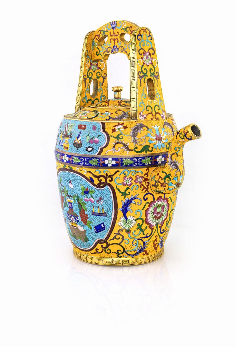 in rame decorato a smalti cloisonné su fondo giallo e riserve turchesi che racchiudono elementi decorativi raffiguranti la dottrina del Nobile Ottuplice Sentiero che nel buddhismo offre ai suoi discepoli il percorso di liberazione dalla sofferenza. La via della liberazione si manifesta in otto tipi di saggezza, vale a dire la Retta Visione,la Retta Intenzione, la Retta Parola, la Retta Azione, la Retta Sussistenza, il Retto Sforzo, la Retta Presenza Mentale, e la Retta Concentrazione. Gli otto elementi sono rappresentati dalla Conchiglia, la Ruota, l’Ombrello, la Bandiera, il Loto, i Pesci, il Nodo Infinito, il Vaso.