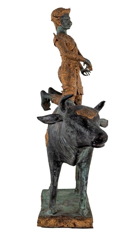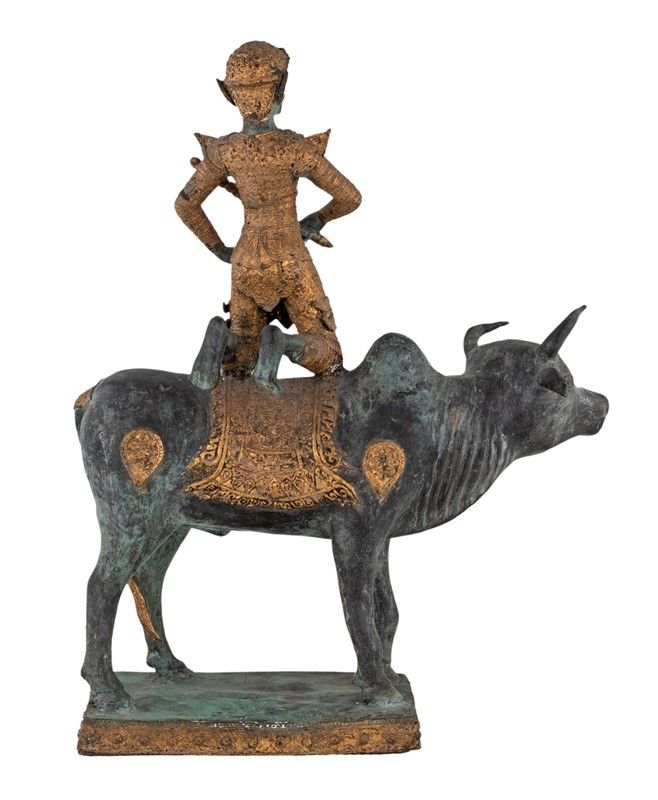 patinato e parzialmente dorato raffigurante un bufalo sulla cui groppa è posto inginocchiato la figura di Rama. India, XX secolo.