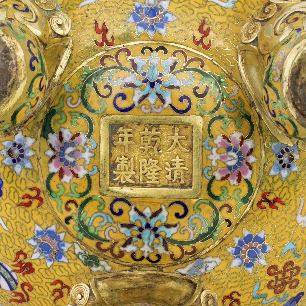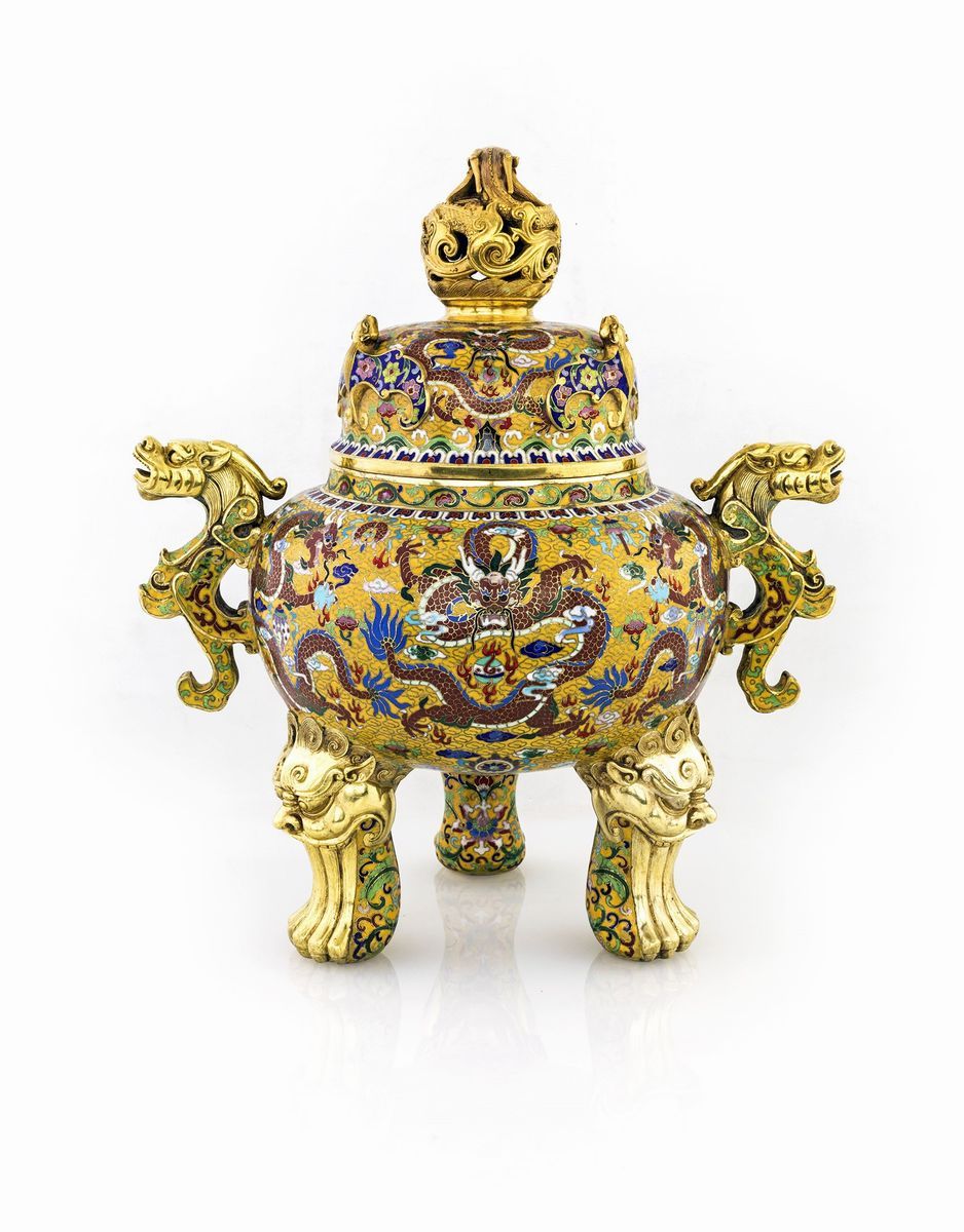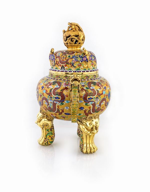 in rame dorato e smalti cloisonné con fitta decorazione a motivi di draghi e pipistrelli fra elementi naturalistici; piedi zoomorfi e anse a guisa di drago. Dinastia Qing, epoca dell'Imperatore Quianlong (1711 - 1799).