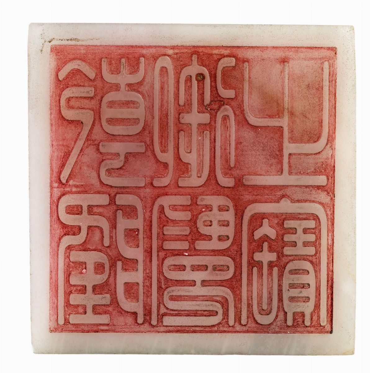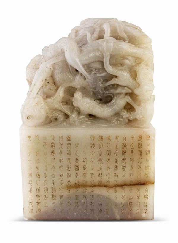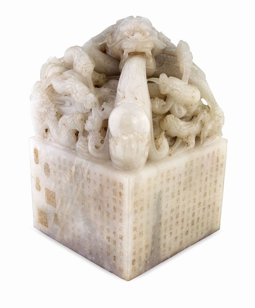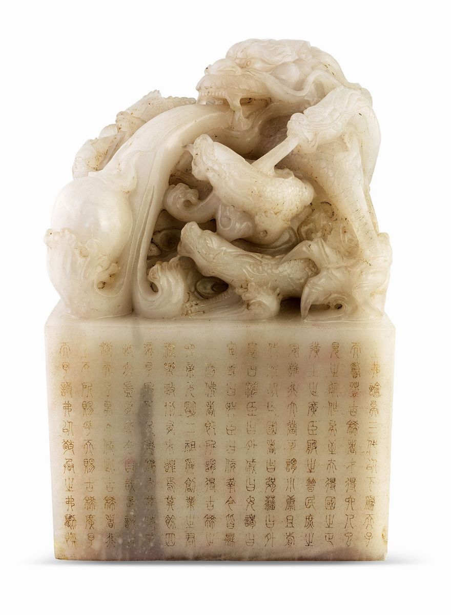 dalla caratteristica forma squadrata, sormontato dalla figura scultorea di un drago dalle cui fauci scaturisce una perla fiammeggiante quale manifestazione della sua anima. Ogni facciata del sigillo è contraddistinta da iscrizioni. Cina, dinastia Qing, epoca dell'Imperatore Qianlong (1711 - 1799)