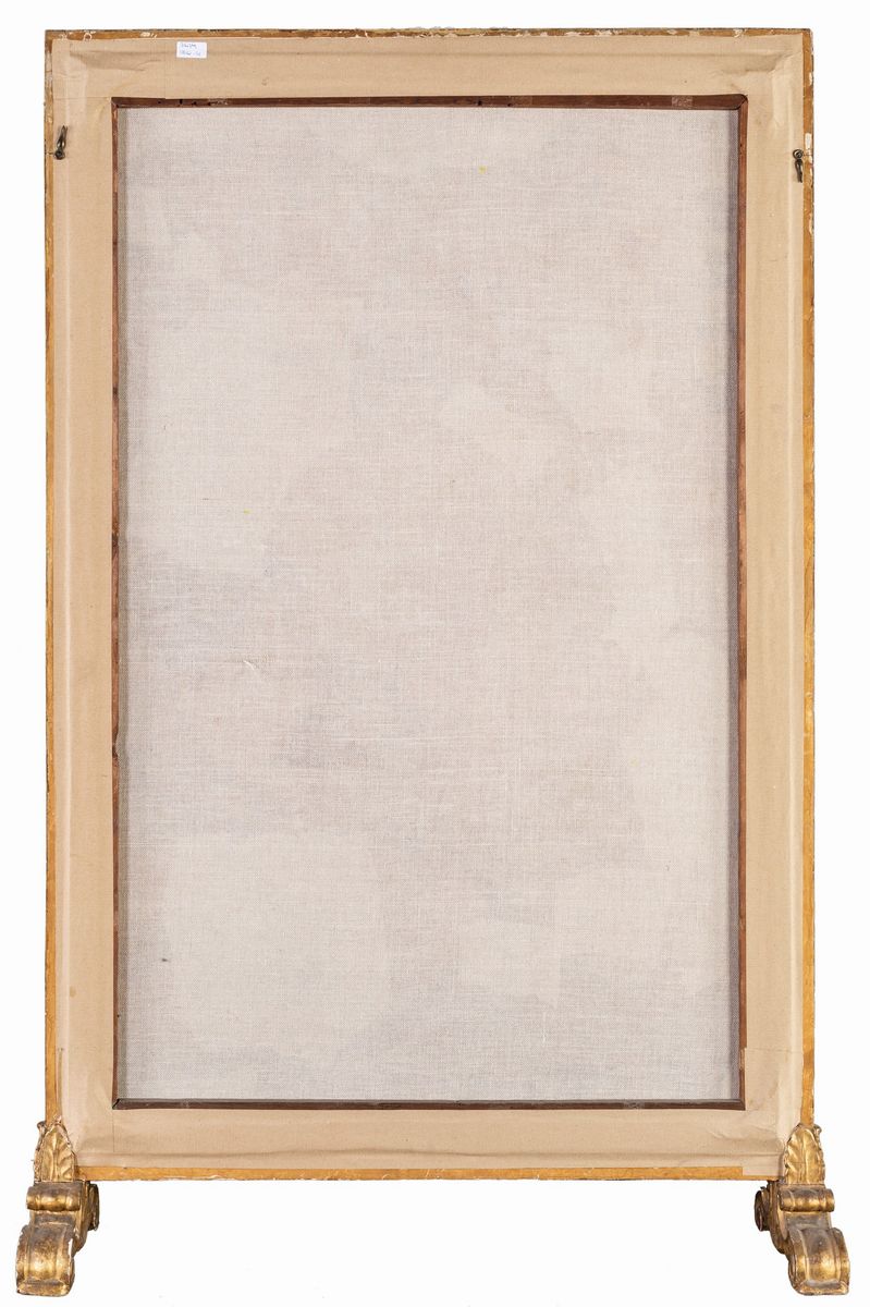 con schermo in seta raffigurante un gallo quale simbolo di protezione contro la sfortuna, ambientato in un paesaggio; a sinistra iscrizione propiziatoria per il futuro di un importante funzionario con timbro in rosso; telaio in legno dorato con cornice intagliata in forma di verghe idealmente legate da rilievi fogliacei. XIX secolo.