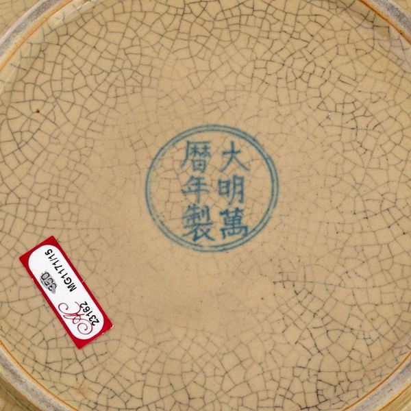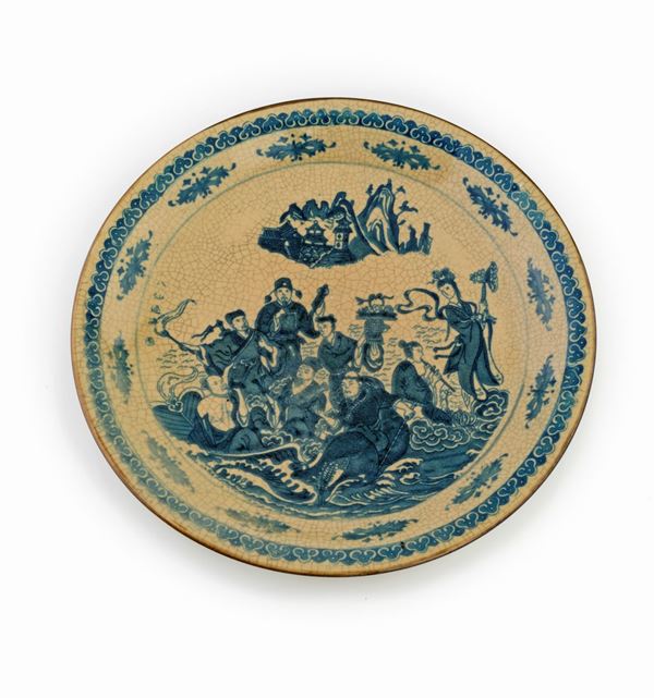 in porcellana con decorazione in monocromia blu su bianco con gli otto Immortali della mitologia cinese. Cina, epoca Ming.