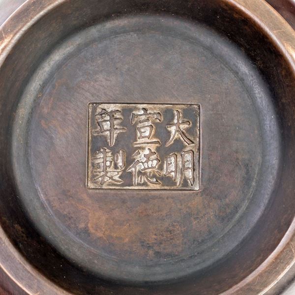 circolare in bronzo con coperchio traforato a motivi naturalistici sormontato da un pomolo. Reca marchio dinastia Ming, Imperatore Xuande.