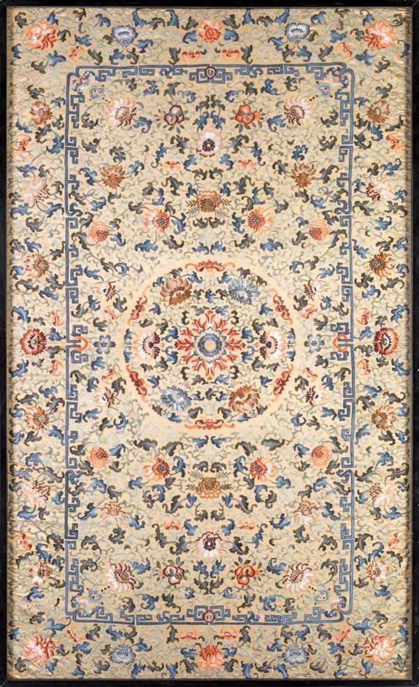 eseguito in vivace policromia su seta a motivi floreali e figure di pipistrello quali simboli di fama, ricchezza e felicità; entro pesante telaio in ferro dipinto. XVIII secolo.
