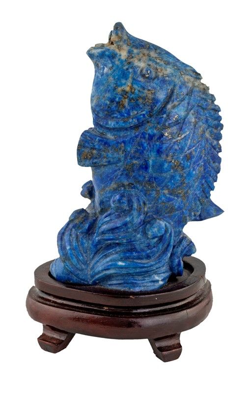 in lapislazuli raffigurante un pesce emergente da flutti; base in legno. Cina, XX secolo.