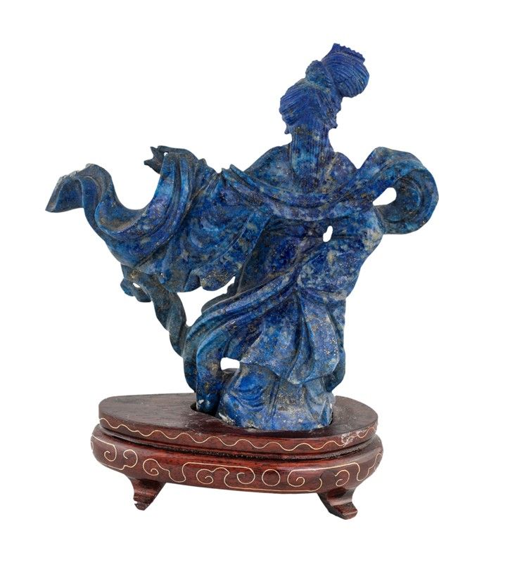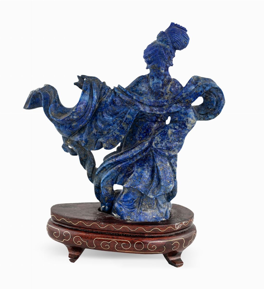 in lapislazuli raffigurante una geisha. Base in legno impreziosita da filettatura in metallo dorato. Cina, XX secolo..