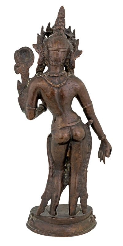 in bronzo brunito raffigurante divinità buddista ritratta in piedi su fior di loto, elemento trattenuto anche nella mano sinistra. XX secolo.