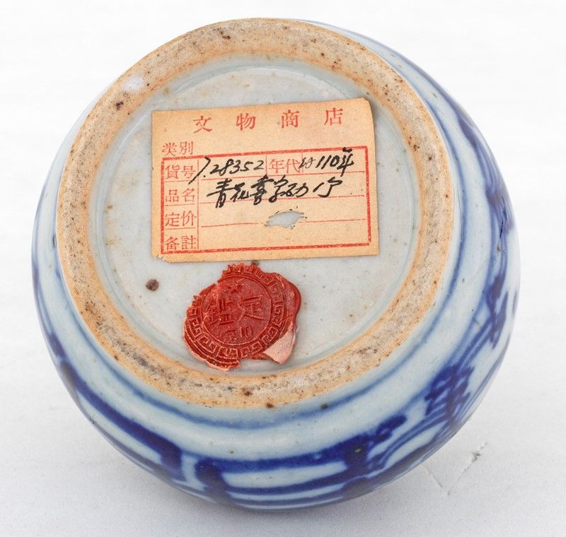 in porcellana di forma sferica con decorazione stilizzata in monocromia blu, Cina, XX secolo.