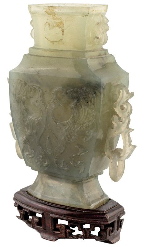 di forma schiacciata su base rettangolare, decorato in bassorilievo con figure di fenice affrontate; anse stilizzate con anello pendente; base in legno. Coperchio mancante. Cina, XX secolo..