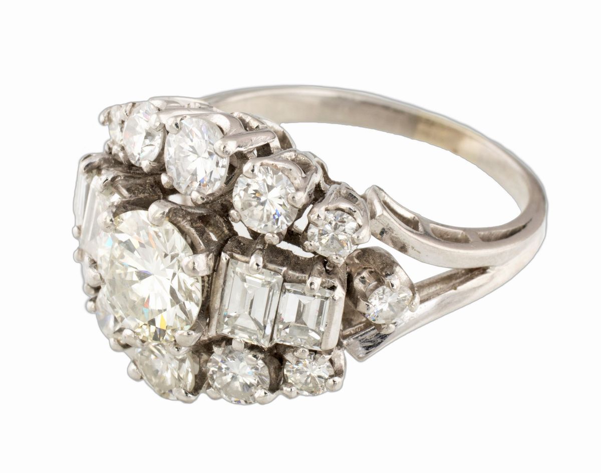 in oro bianco con brillante centrale mm 6,6, ct 1,20, 12 brillanti ct 1,60, 4 diamanti baguette ct 0,50, oro g 11,00.